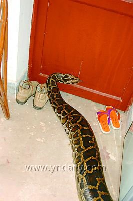 一出铁柜,这条巨蟒就拖着肥硕的身躯向着阳光下的主人家门前爬去,随后抬起头爬上主人脚背蹭来蹭去地撒了一会儿娇后,开始熟门熟路地爬进主人客厅,而且毫不客气地爬上沙发后又扭来扭去,将陪同记者采访的民警老袁吓得脸色骤变。最后看到主人打开电视机时,这条巨蟒又慢悠悠地爬到电视机前静静地躺着,好像也会欣赏电视节目一般。