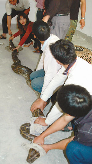随后,接到报告的野生动植物保护站工作人员赶到现场,将蟒蛇装进一个大竹笼拉回林业站,这条蟒蛇没有一点反抗。