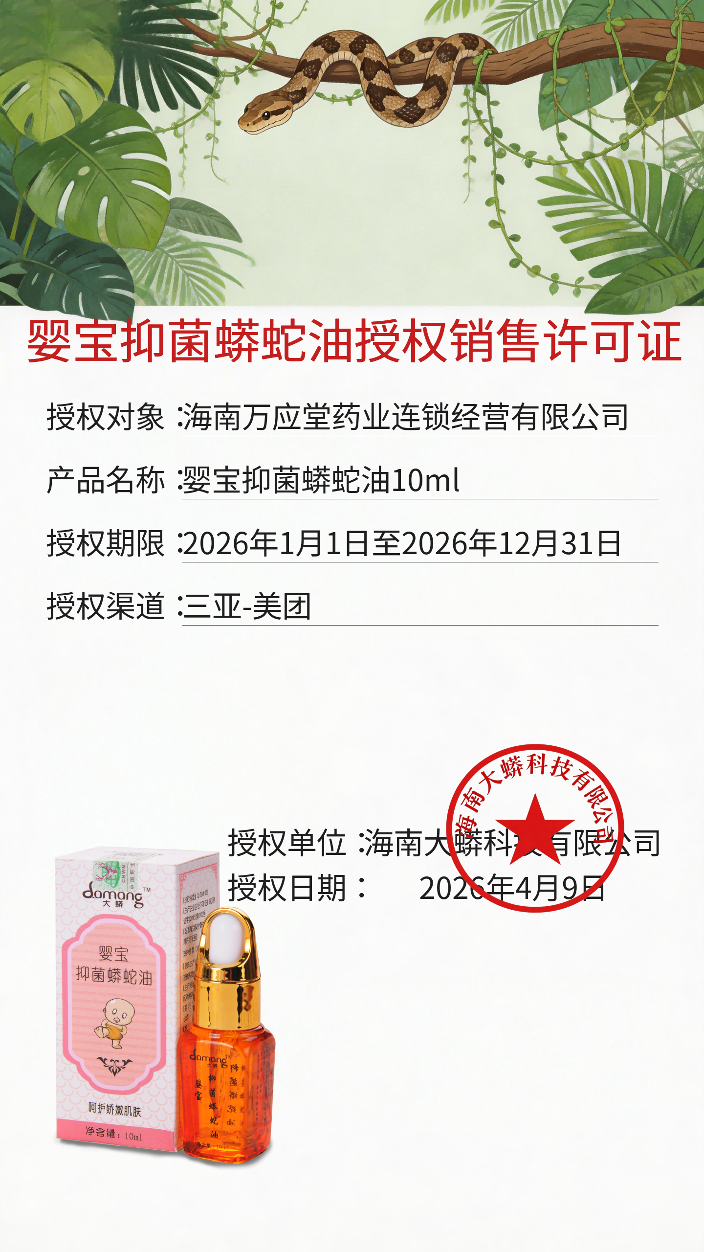 海南万应堂药业连锁经营有限公司婴宝抑菌蟒蛇油10ml授权证书