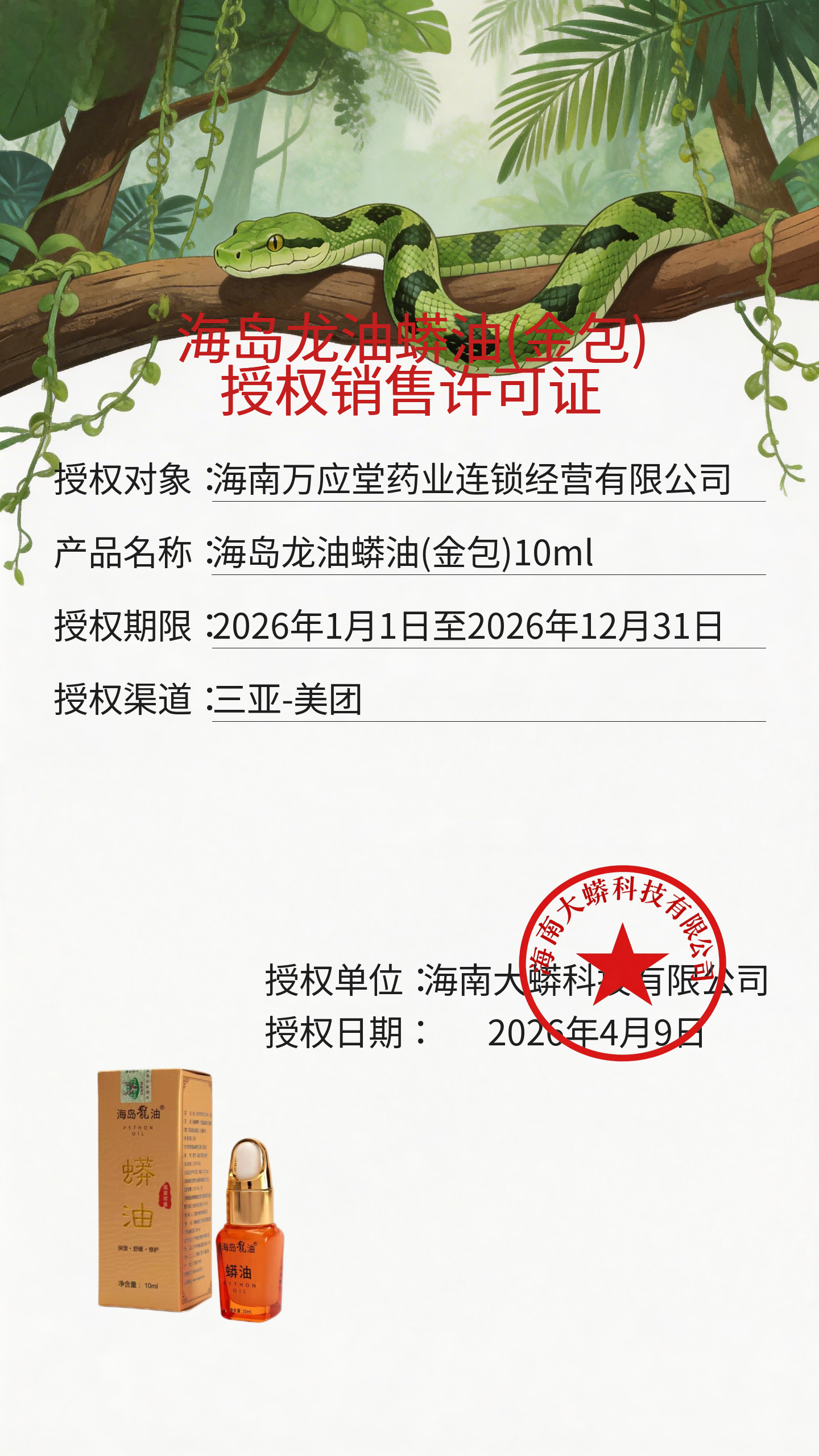 海南万应堂药业连锁经营有限公司海岛龙油蟒油(金包)10ml授权证书