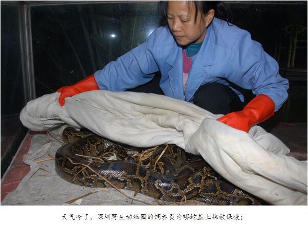 香市动物园进门不远处,记者发现了最怕冷的动物———大蟒蛇。蟒蛇不但裹上了厚厚的棉被,旁边还有取暖器加温。在蛇园,记者看到青蛇、蜥蜴等爬行动物也有这样的待遇。对蛇类冷血动物,饲养员表示,室内温度一般控制在25摄氏度左右。动物园怕冷的动物还不少,黑猩猩、环尾狐猴等也是靠取暖器加温过冬。