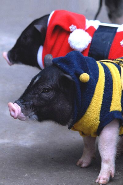 深圳野生动物园的香猪穿上饲养员为它们量身定做的新冬衣。