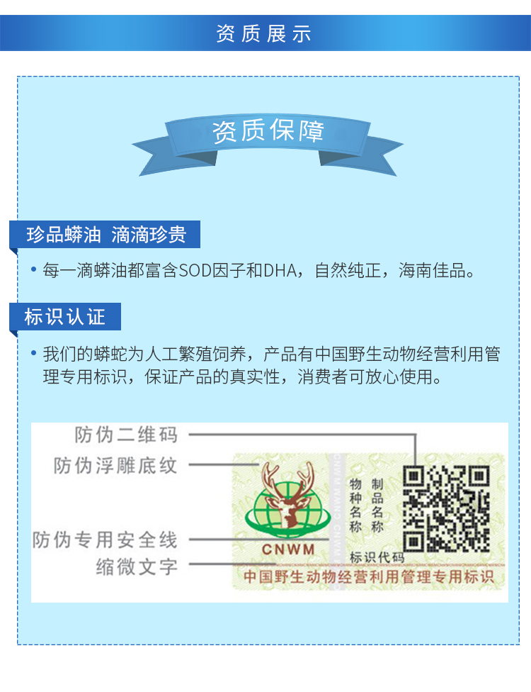 宣传口号:可以吃的蛇油产品、海南蟒油 皮肤无忧、 有绿色野保标识的才是真正的蛇油产品