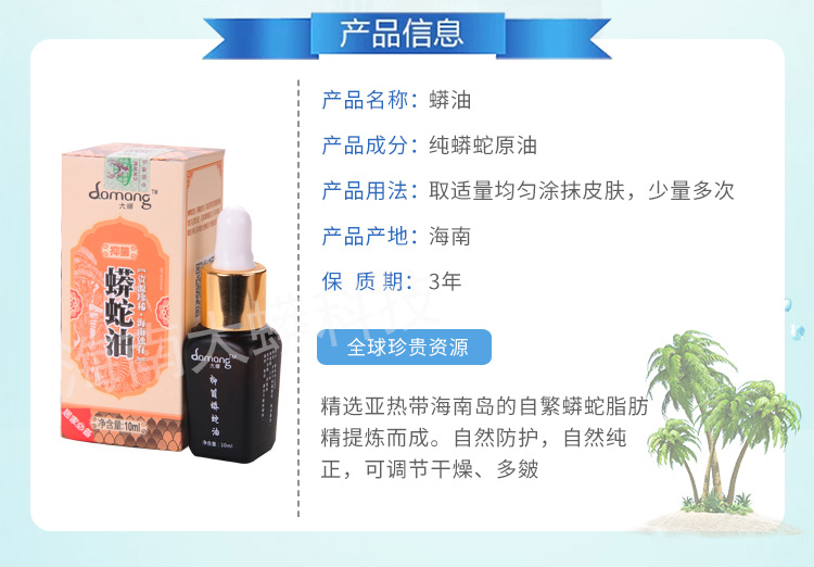 产品成份:100%纯蟒蛇油 (有绿色野生动物保护标识)