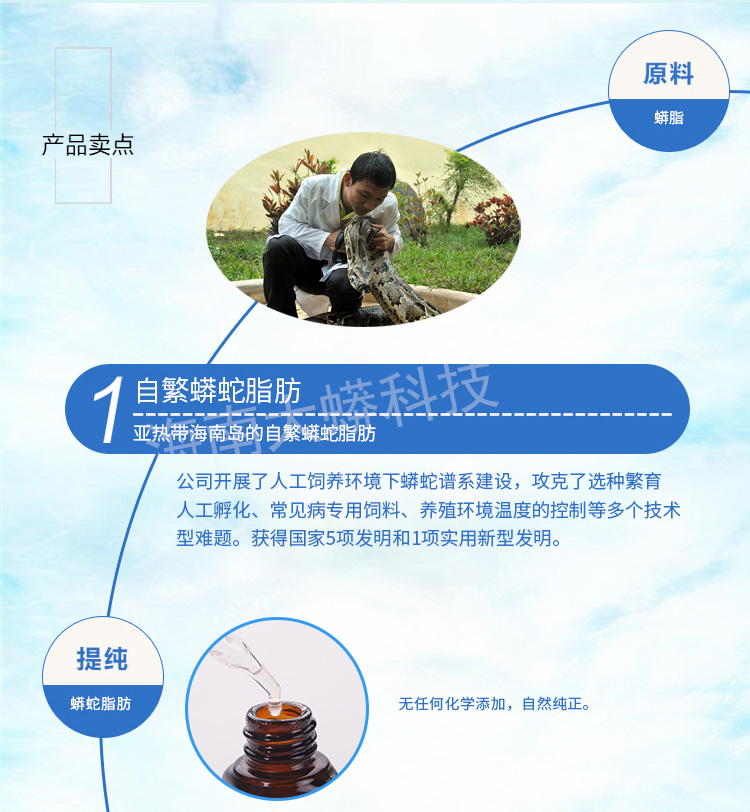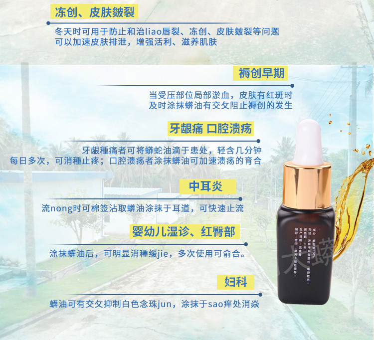 产品特点:100%纯蟒蛇油、无任何添加、无激素、无剌激或不适感、效果明显、溶解吸收快、无残留、捷带使用方便。