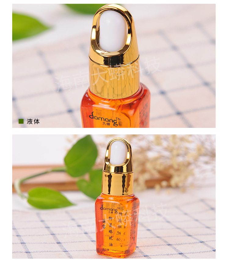 产品特点:100%纯蟒蛇油、无任何添加、无激素、无剌激或不适感、效果明显、溶解吸收快、无残留、捷带使用方便。