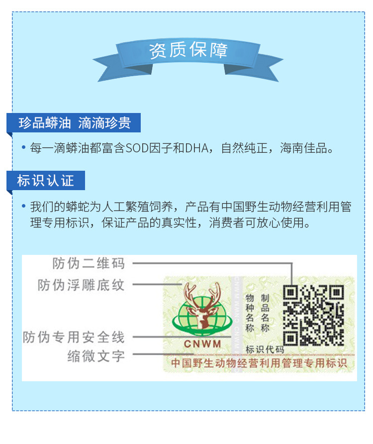 产品成份:100%纯蟒蛇油 (有绿色野生动物保护标识)